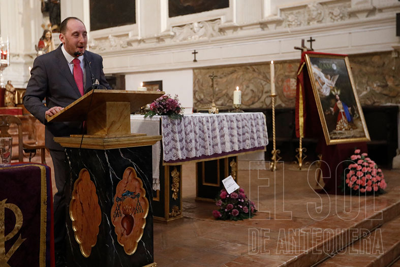 Narró empezar y cerrar el día mirando a su Rey de Reyes. «Todos miramos el cielo aguardando el momento, el momento lunar, esa luna llena que nos anuncia que el Domingo de Ramos está cerca, esa luna que ilumina Antequera en la oscuridad de la noche, esa luna que proclama que la primavera ya ha llegado, una luna que nos recuerda que debemos prepararnos durante toda la cuaresma para vivir con plenitud la pasión, muerte y resurrección de Jesucristo. Ese momento lunar, esa luna llena conocida como Luna Rosa, que marcó justamente lo ocurrido hace un año al coincidir con el Domingo de Ramos».