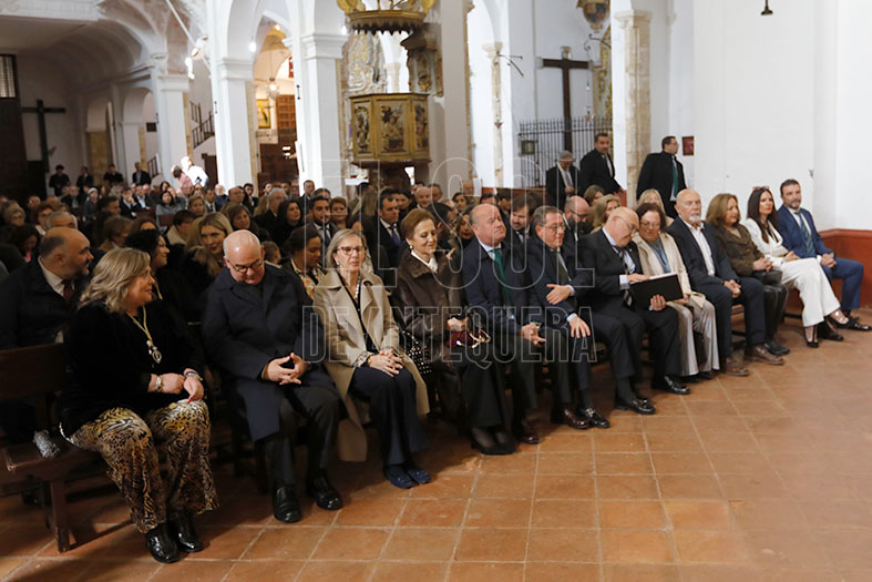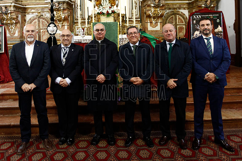 En la presidencia, el alcalde Manuel Barón, el hermano mayor de la cofradía, Juan Manuel Vegas, el consiliario Francisco Aurioles, la presidenta de la Agrupación Trinidad Calvo, el pregonero de la inminente Semana Santa, Pablo Javier Guerrero, así como los autores de los carteles, Juan Antonio Pinto Machuca en una pintura del Vía Crucis del Nazareno de la Sangre y Francisco Tejada Domínguez, una fotografía para el Lunes Santo de 2025.
