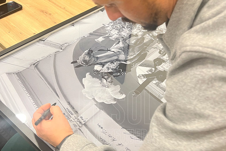 Recibió una aguja con ‘El Angelote’ y tras la conferencia, visitó las iglesias de San Francisco y Santa Eufemia, cenando, cómo no, en «La Madrugá» de calle Infante don Fernando junto a la Plaza de San Sebastián. En el Especial de Semana Santa ampliaremos información con un reportaje del acto.