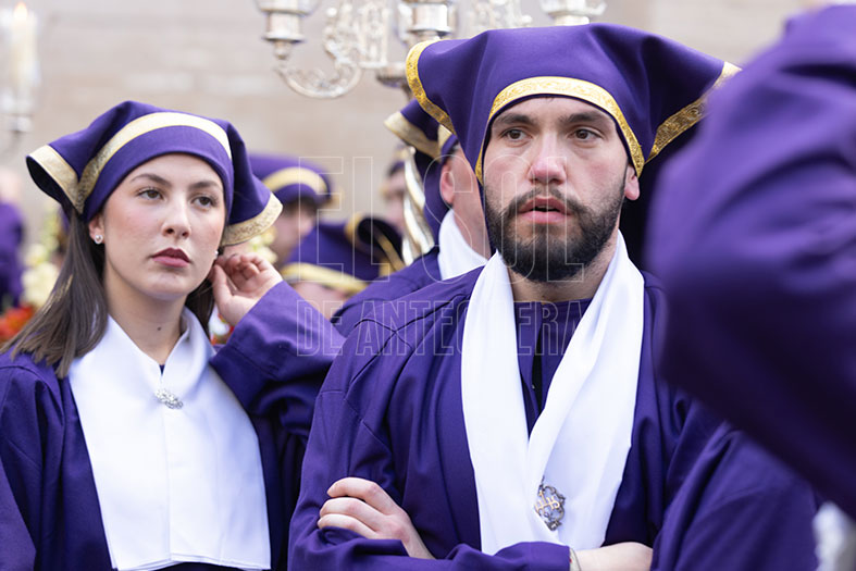 Mágicos momentos del atardecer del Viernes Santo, con el cielo azul y, por momentos, con tonos morados como los de la cofradía. Una hermandad que sigue apostando por recuperar las figuras de la armadilla, como son los penitentes con túnica de terciopelo con cola, sin capirote y con capuz, algo propio de nuestra Semana Santa.