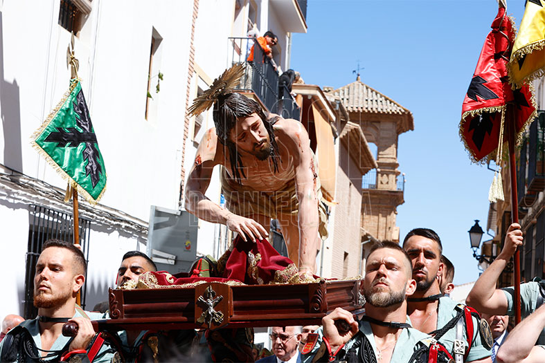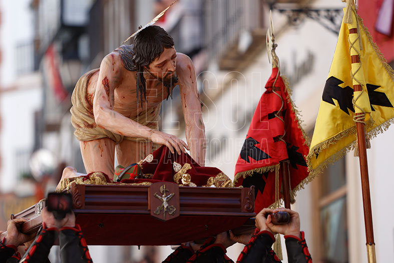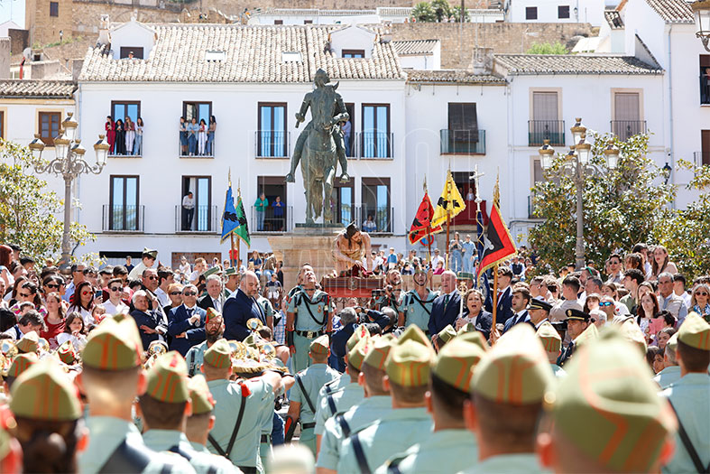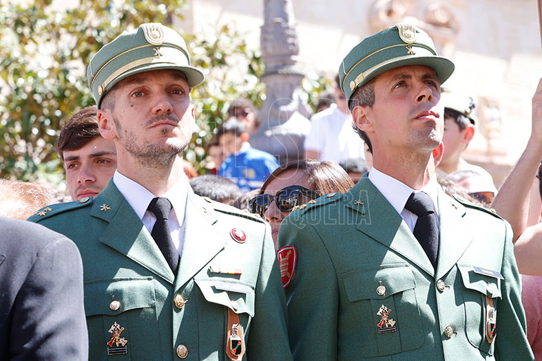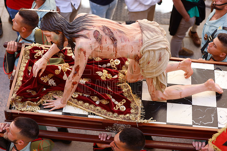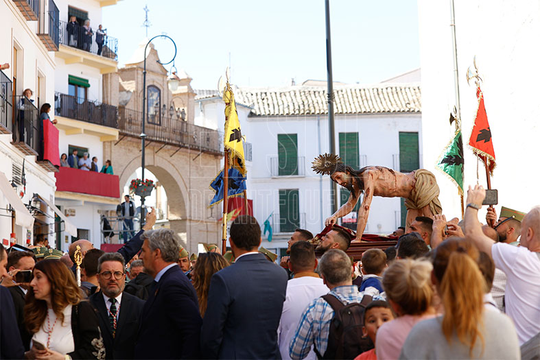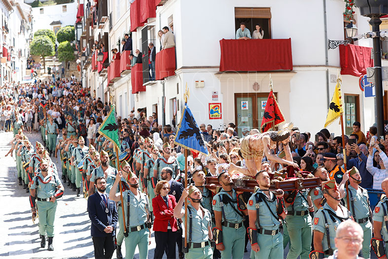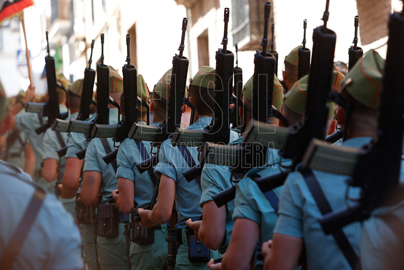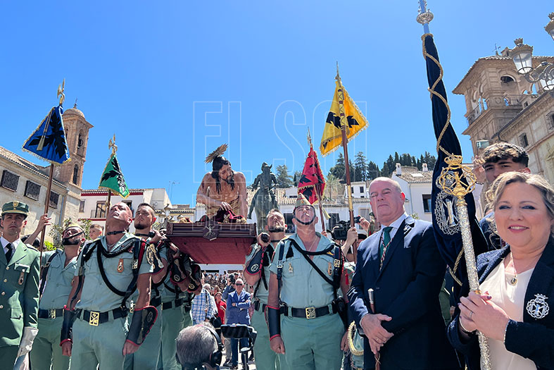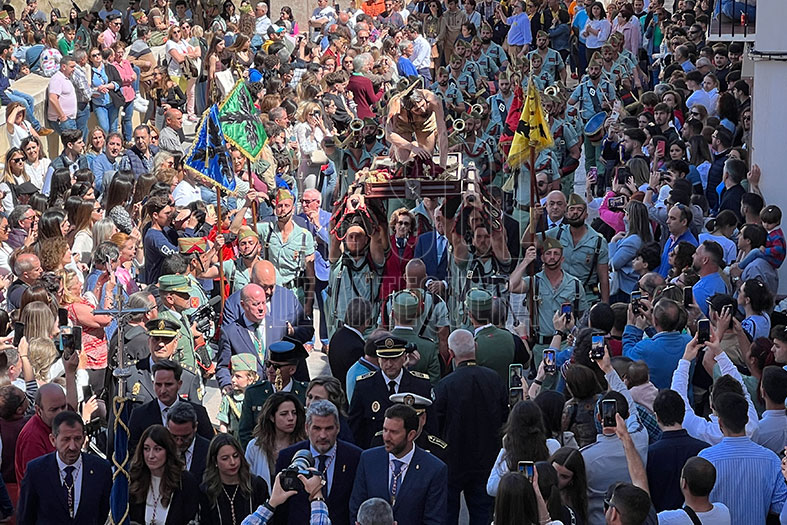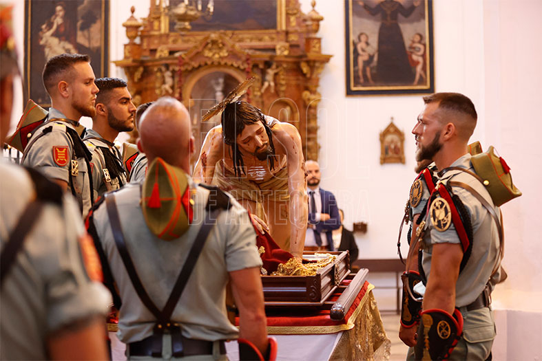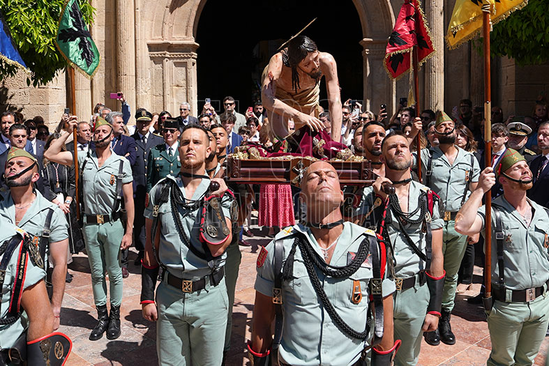 A las 13,30 horas, los caballeros legionarios entran al templo para llevar en traslado al Señor. Salida por la puerta de la iglesia de calle Encarnación y bajada hasta el Coso Viejo, lleno de público que veía cómo La Legión llevaba al Señor por las calles del casco antiguo.