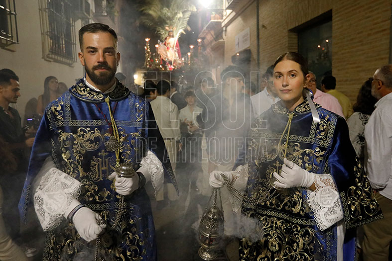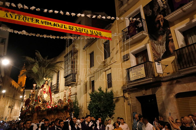 Con «Ehyeh» se presagiaba lo que iba a pasar: ¡qué locura cofrade! Será estrechez, será cómo retumban los instrumentos, será ver a gente en sus balcones que acarician la imagen… Duranes debería ser paso casi obligado de las cofradías. Con «El día del Señor» se sintió lo que muchos cofrades ven en otras localidades o en los vídeos de las redes sociales. No se podían creer que esas notas marcaran el esfuerzo por llevar a todo lo alto al Señor en Antequera.