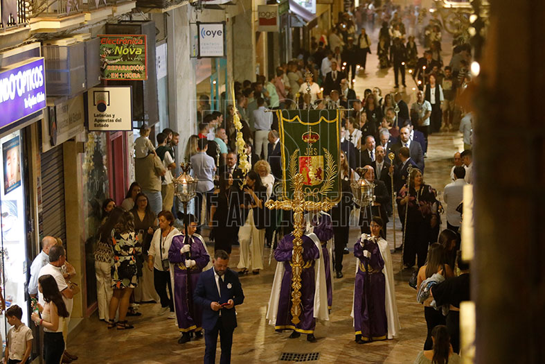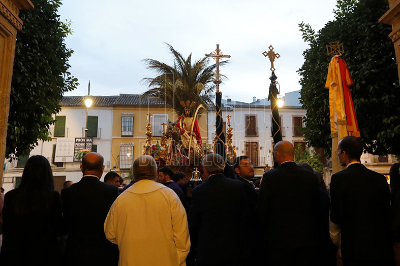 La imagen, que iba sola, sin las mujeres y niños que lo vitorean cada Domingo de Ramos, salió pasadas las 19,30 horas desde San Agustín, con un cortejo sencillo formado por una cruz guía, dos faroles, un antiguo estandarte y el guión presidencial, donde el hermano mayor Antonio González contó con el acompañamiento del alcalde Manuel Barón, así como otros miembros del consistorio, hermanos mayores y directivos de cofradías de Gloria y Pasión, la Parroquia de San Sebastián, además de los representantes de otras cofradías que se han desplazado por el congreso nacional.