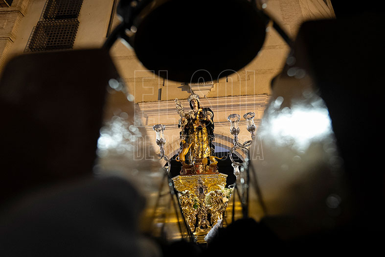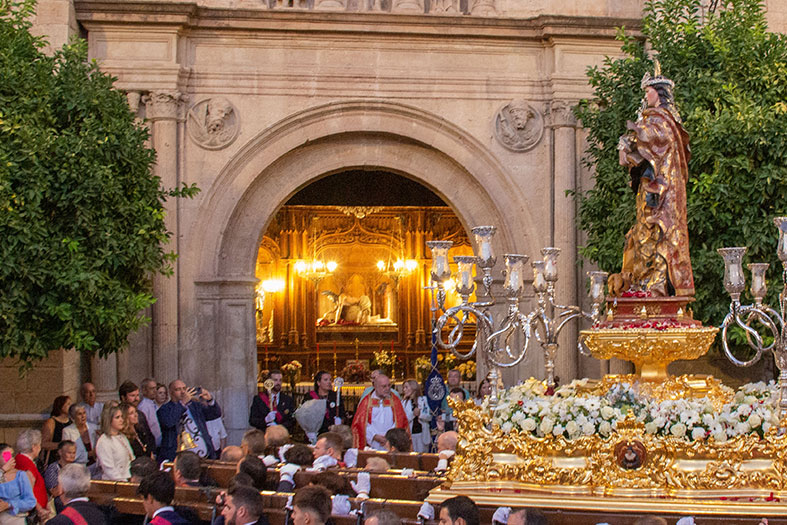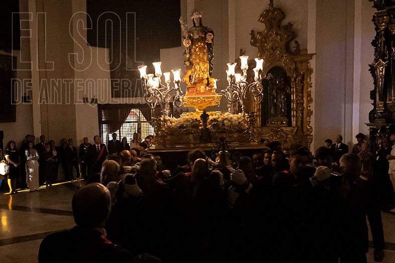 Llegaba el tramo final por Fernández Viagas, Cristo de los Avisos y de nuevo por Carrera de Madre Carmen para llegar, pasadas las 22 horas, a la Plaza de Santiago. Allí los vecinos, con las puertas de la Parroquia de Santiago abiertas, recibían a la Patrona Ganadora, a la que se le ofreció la última de las candelas. Llegaba el final con entrada al interior del templo, con oración íntima de la fusión entre devotos, hermanacos y la Banda de La Estrella de Jaén que son la ampliación de las andas.