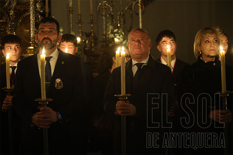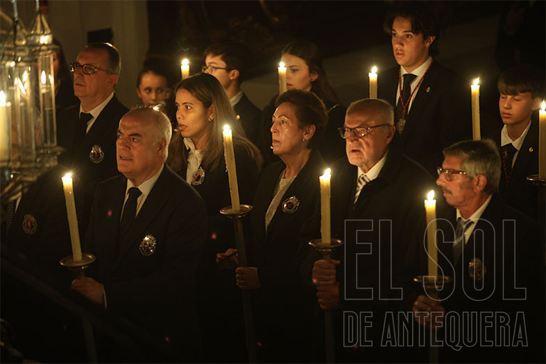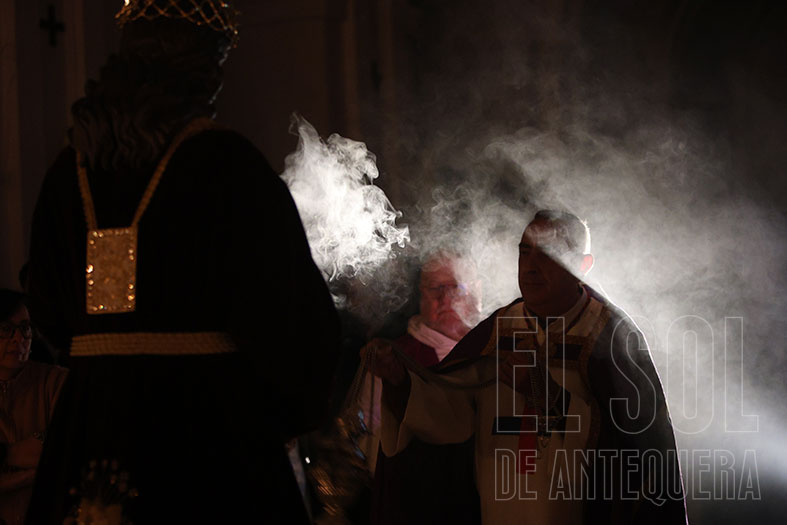 Los devotos, que portaban cirios encendidos, flanquearon al trono del Señor, en el centro del presbiterio. Empezó la liturgia con lecturas, el Evangelio y una pequeña reflexión del Arcipreste que se acordó de los que no podían estar por enfermedad, de las personas desprotegidas o las que viven en guerras.