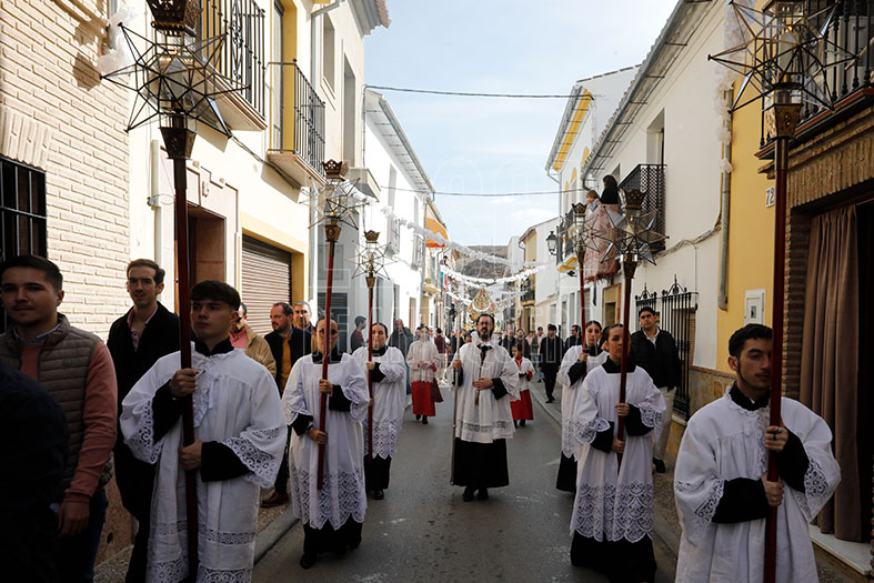 Siguió por calle Belén, donde los Dolores esperaban en la puerta de su templo en el que las religiosas clarisas rezaron a la Virgen. El cortejo discurrió por Puerta de Granada, Cazorla y entrada en Hornos, con calles engalanadas con colgaduras que simulaban flores blancas y balconeras. Se fusionó el rezo del rosario por parte del párroco Francisco de Paula Aurioles con las marchas de la banda.