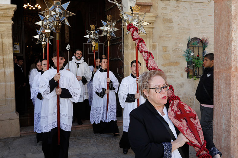 A las 12 del mediodía comenzó desde el interior de la iglesia parroquial de Santiago, con un cortejo formado por una cruz guía y dos faroles, más de una decena de personas alumbrando con velas en dos filas, el guión de la cofradía portado por un directivo, un cuerpo de siete acólitos de monaguillo y faroles, y el trono de la Virgen de la Salud, dirigido por José Castillo, que procesionó sobre las andas del Señor de la Piedad de la Trinidad.