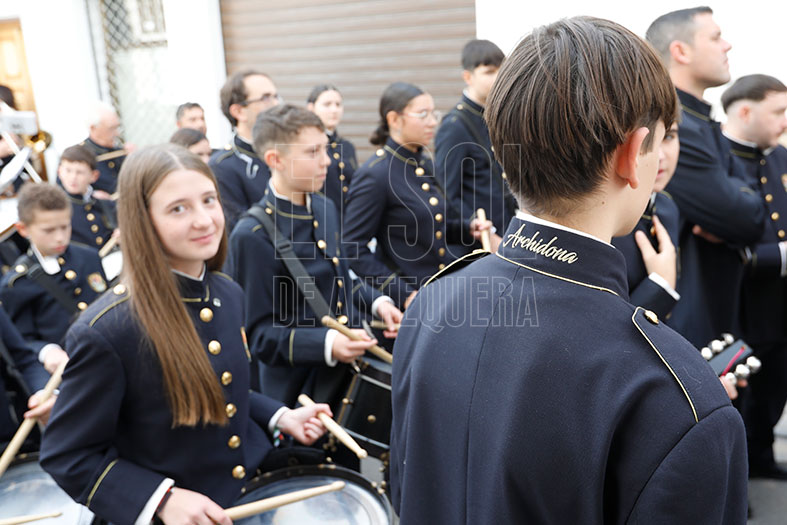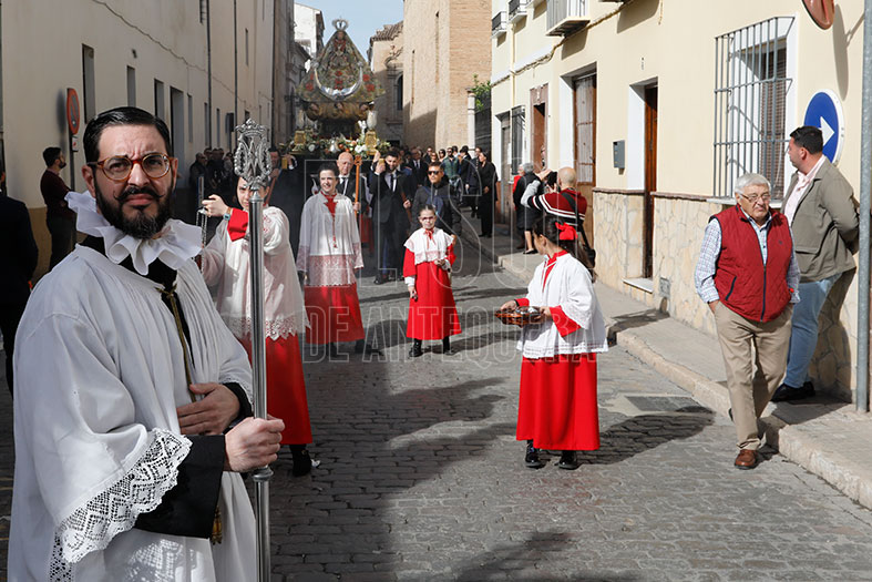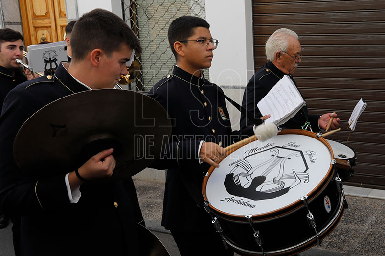 En la plaza aguardaba la Banda José Antonio Galán de Archidona que vino en desfile y tocó marchas en el cortejo en la procesión de alabanza que guardó orden y seriedad con aires más de Pasión que de Gloria. Nada más salir, «encuentro» de la Virgen de la Salud con Santa Eufemia y su hermandad, que estaba en su trono en la puerta de su templo. Tras la imagen mariana, les siguieron dos monaguillos, la representación municipal con el alcalde Manuel Barón al frente, el hermano mayor Miguel Rodríguez, representantes de cofradías, devotos y la banda.
