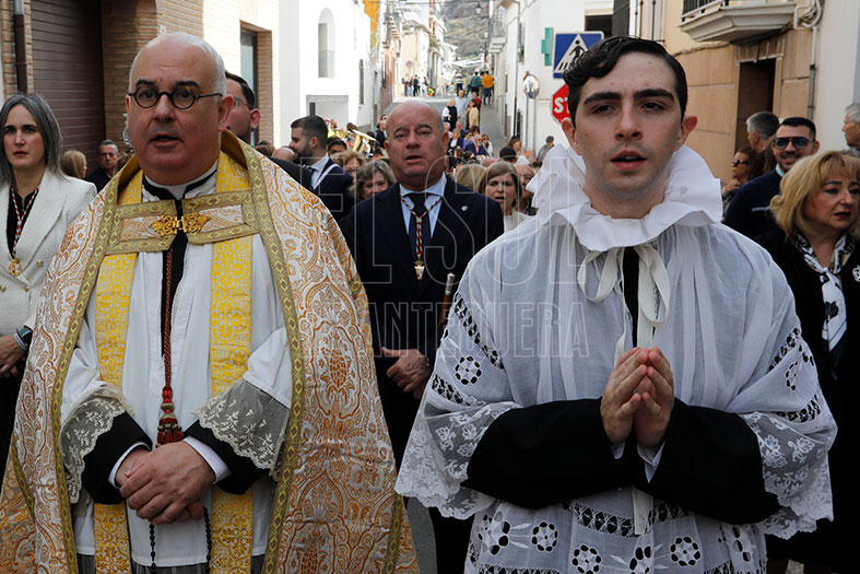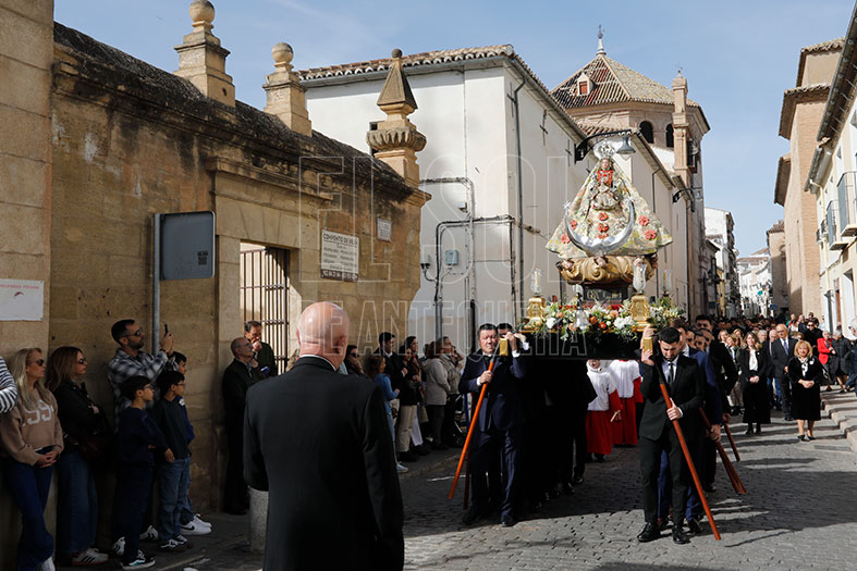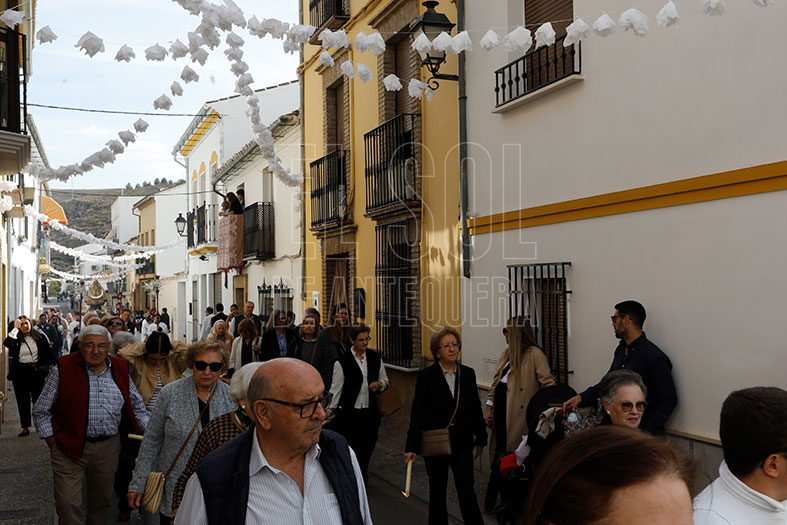 Siguió por calle Belén, donde los Dolores esperaban en la puerta de su templo en el que las religiosas clarisas rezaron a la Virgen. El cortejo discurrió por Puerta de Granada, Cazorla y entrada en Hornos, con calles engalanadas con colgaduras que simulaban flores blancas y balconeras. Se fusionó el rezo del rosario por parte del párroco Francisco de Paula Aurioles con las marchas de la banda.