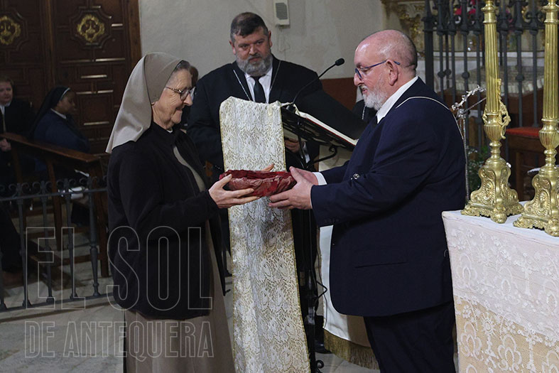 Así, tras misa presidida por el párroco Francisco de Paula Aurioles, la Madre General Joaquina González hizo entrega al hermano mayor, Francisco González, de una reliquia de la Beata que potará la Virgen a sus pies en el palio procesional.