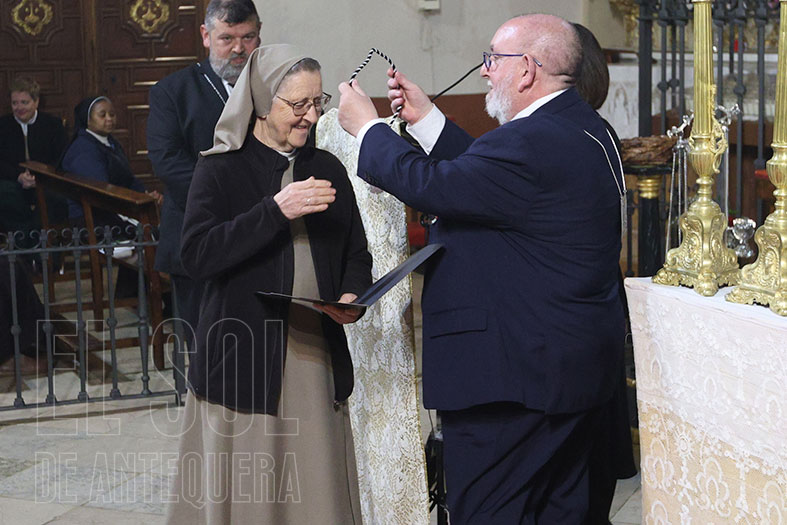 Se le entregó un agradecimiento y una medalla de la hermandad de Santiago a la descendiente de la Beata antequerana camino de la santidad. Entre los presentes, el alcalde de la ciudad, Manuel Barón.