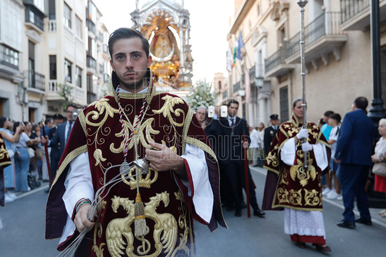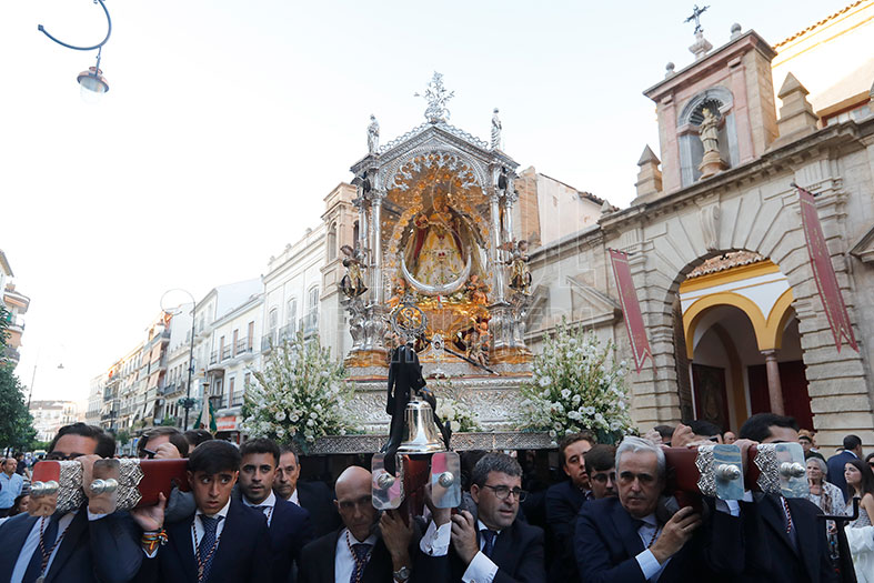 Tras la misa, a las 20,06 horas, el hermano mayor de insignia, Justo Moreno Muñoz, tocaba la campana para avisar a sus hermanacos que iba a empezar la procesión. El cortejo se había formado en la calle Infante don Fernando. Salida estrecha y complicada del templete de plata de la Virgen, primero por la puerta de la iglesia con el atrio y por último de éste con la calle.