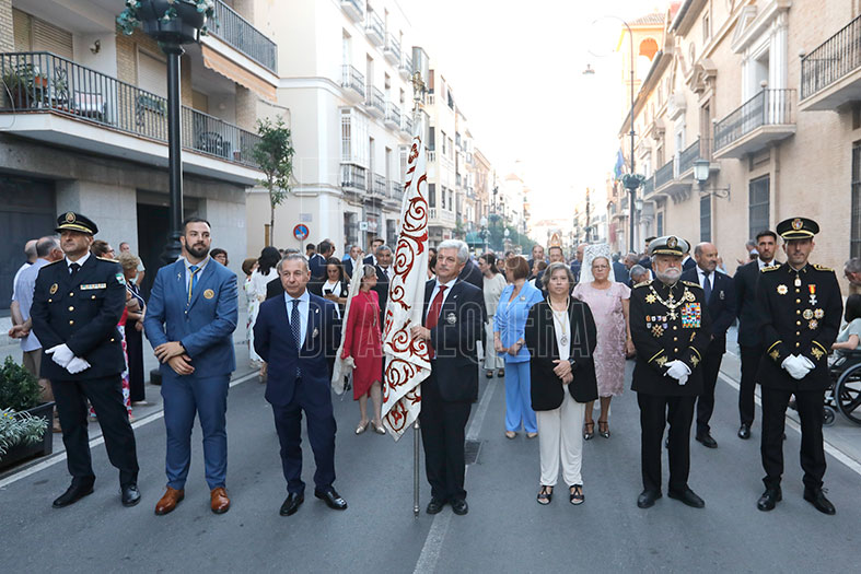 El arcipreste y párroco Antonio Fernández fue tras la Virgen, abriendo el acompañamiento de un grupo de devotos. Seguía con la representación municipal con el alcalde Manuel Barón al frente y la concejal más joven, Marta González, portando el Pendón de Antequera. Por último la Banda de Música Vera Cruz de Almogía.