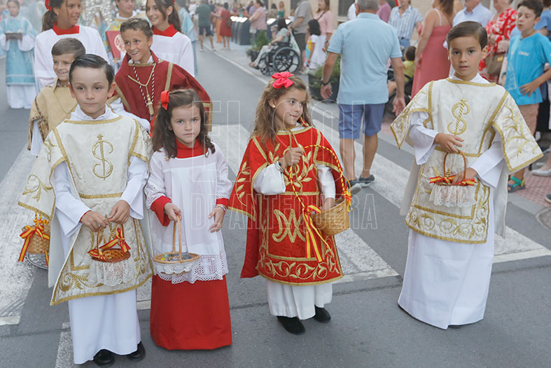 Abría el cortejo una cruz con dos acólitas con dalmáticas y ciriales, ante el guión presidencial donde estaba el esclavo mayor Justo Muñoz Blázquez. Seguían una decena de niños vestidos de monaguillo con de acólitos con dalmáticas, a continuación, un cuerpo de nueve acólitos con dalmática portando el Evangelio, un gallardete de plata e incienso. Y el tramo final de once acólitos con dalmática, turiferarios y con ciriales.