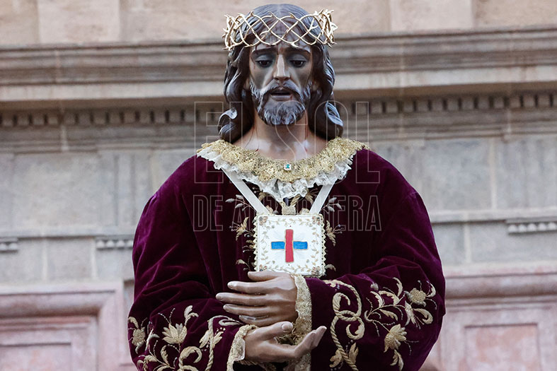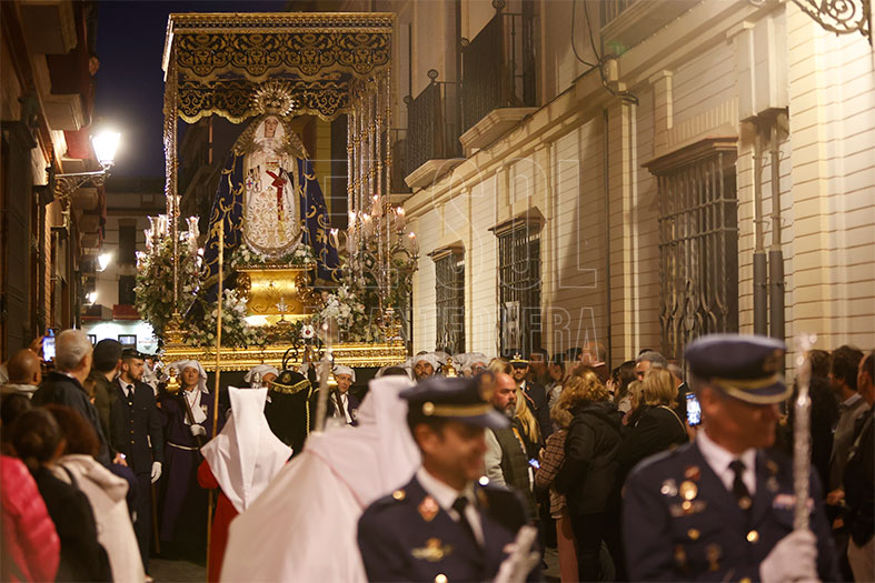 Desfile concurrido y salida puntual. Oración y muy, muy buena organización. Se dejó el palio de la Virgen tras la puerta y salió primero, dirigiéndose directamente hacia calle Porterías, lo que no ralentizó la salida. Tras Ella, el Señor del Rescate. Expectación por escuchar y sentir la oración de su hermano mayor de insignia, Guillermo Ramos Pérez, quien pidió por la fe y las donaciones de órganos. Sin palabras.