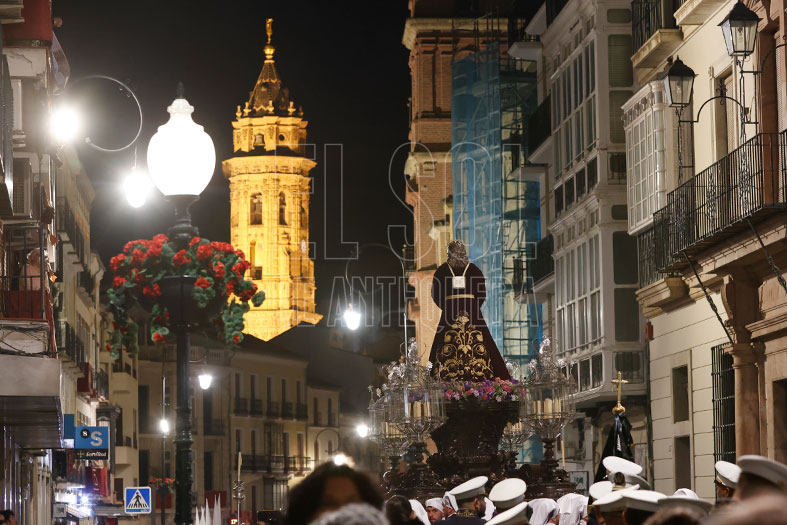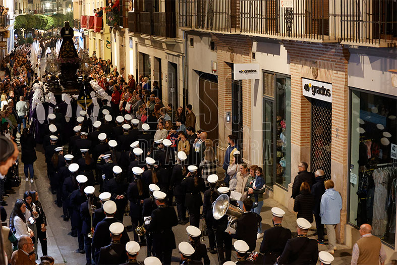 Y partía el cortejo por su barrio. Impresionante. Calle Porterías, balcones llenos, decorados, con sus vecinos y familiares. Aceras contemplando el caminar y preparándose para alumbrar al Señor. Y entrada por Vega con la Asociación Cultural Musical Banda de Música Cruz del Humilladero de Málaga que con un centenar de componentes fueron extensión del palio y manto de la Piedad. Momentos únicos y unas calles llenas de fervor. ¡Lo que nos perdemos por no fomentar mayor uso de calles de barrio y estrechas!