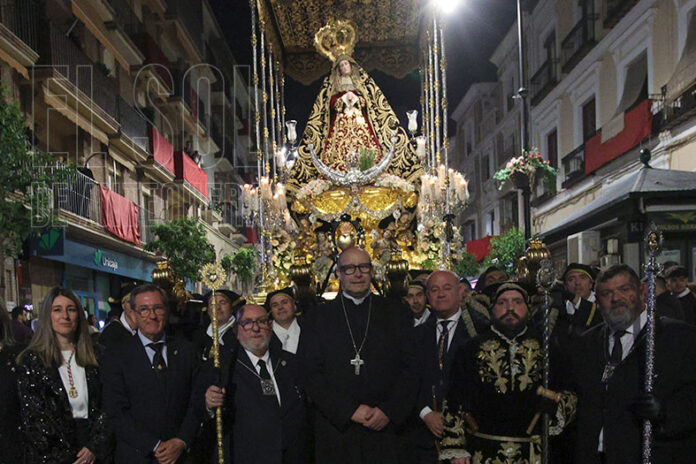 Buen mecer del palio de la Virgen, que a pesar de su fragilidad, los hermanacos supieron hacerlo en justa medida. Y tras Ella, un destacado grupo de devotos alumbrando y la Asociación Musical ‘Las Flores’ de Málaga, que no paró de interpretar oraciones hechas marchas. Y entrada en calle Infante don Fernando, y entre el tramo del Ayuntamiento y las Cuatro Esquinas, el Obispo de Málaga que admira a la cofradía del estilo antequerano. Llamó la atención un grupo de jóvenes que se acercaron a saludarle y entregarle estampas de las imágenes titulares. Cada hermano mayor, fue en su búsqueda para que tocara la campana a los tres tronos. Al llegar a la Virgen de los Dolores, se interesó por las reliquias que portan los ángeles del trono: los beatos Madre Carmen, Enrique Vidaurreta y Tiburcio Arnaiz y Santa Eufemia. Fue el momento en el que este periódico pidió la foto oficial de la visita ante la Virgen y ahí queda.