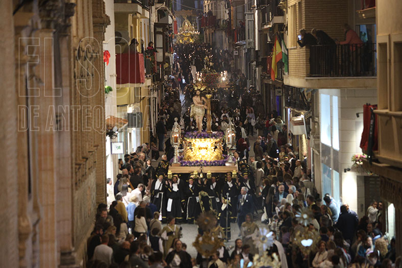 Desfile de la Armadilla desde la Biblioteca de San Zoilo anunciando que lo iba a llegar. Oración del párroco Francisco de Paula Aurioles, pidiendo a los hermanacos a ser ejemplo de Jesús en el Día de la Eucaristía. Y el hermano mayor que ordena se abran las puertas. Ordenada salida del cortejo y una Cuesta Merino, calle Belén y Plaza de Santiago que vibraba como los buenos tiempos con su cofradía. Antequera, como andaluza que es, siempre es muy alegre, pero qué emoción con el «arriba» del Señor Atado a la Columna. Su hermano mayor, se lo dedicó a todas las personas enfermas, sobre todo a las que padecen el cáncer. Hubo vítores y aplausos, pero rompiendo las lágrimas y emoción transmitidas por un hermano mayor que, como la mayoría de los directivos, se estrenaban en sus quehaceres en el Jueves Santo.