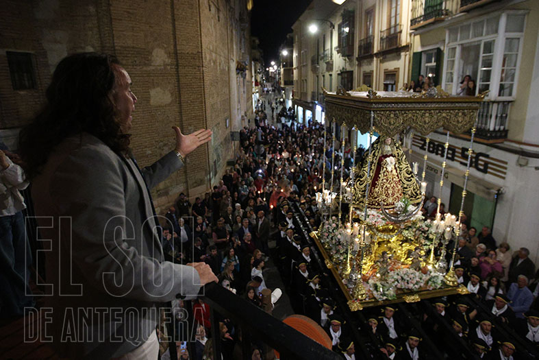 Y bajada por calle Lucena. ¡Cómo estaba la calle! Sin ser parte del recorrido oficial, le da a la Semana Santa lo que precisa de una calle: estrechez, cercanía, devotos en las aceras, rozando los palios desde los balcones, unión y sentimiento. Y al llegar a Madre de Dios, Luis Perdiguero que sale a un balcón y canta a la Virgen de los Dolores, que paró en la encrucijada de caminos para que así la pudieran disfrutar los cuatro puntos cardinales. La mejor saeta de este año hasta el momento. Luis, emocionado, terminó con un viva Antequera, aplaudiendo el público que se agolpaba en el lugar reconociendo al paisano. Por cierto, tramo que se hizo en parte sin ruido para las personas don problemas de autismo o a quienes les moleste el procesionar en todo su esplendor.