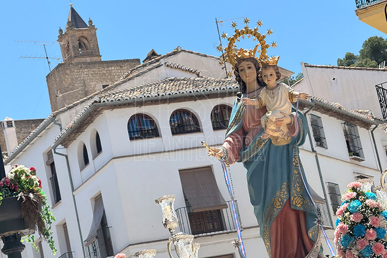 María Auxiliadora vivió una intensa semana en Antequera con triduo, festividad y procesión, que este año se desarrolló en la mañana del domingo 25 de mayo, en un día muy soleado, con altas temperaturas que llegaron a los 35 años, y ampliando su recorrido llegando a la Plaza de San Sebastián.
