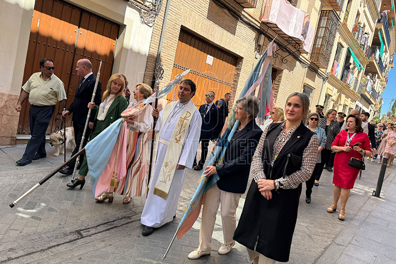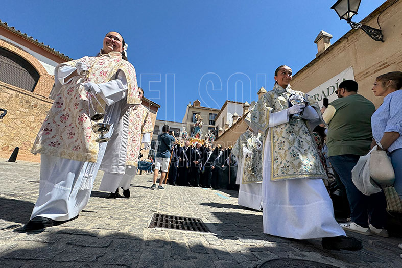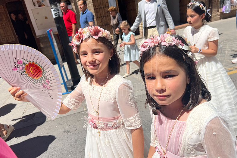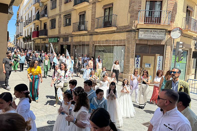 Desde ahí se notó el intenso calor, inapropiado de un mes de mayo. Los niños de Primera Comunión buscaban la leve sombra que daba desde entonces el recorrido. Siguieron por Plaza de San Francisco, Calzada, subida de Encarnación con parada ante el convento de las carmelitas calzadas, y entraron en la puerta de la Plaza de San Sebastián donde fueron recibidos por la comunidad parroquial.