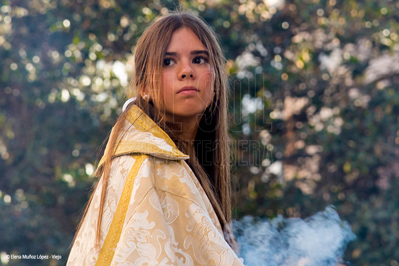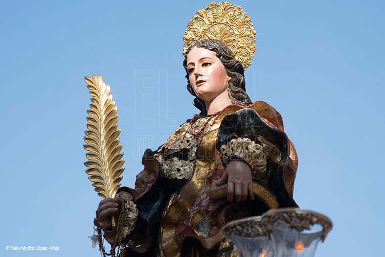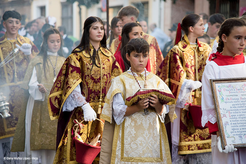 Cerca de medio centenar de acólitos de monaguillo, con cornucopias, estandartes, con dalmáticas, turiferarios, con ciriales, cruz alzada y el trono de la Santa, con Antonio José Guerrero Clavijo, contando con la ayuda de Eufemia Guerrero Sánchez, al frente de los 72 hermanacos, 6 bajo el submarino, con traje oscuro y banda carmesí.