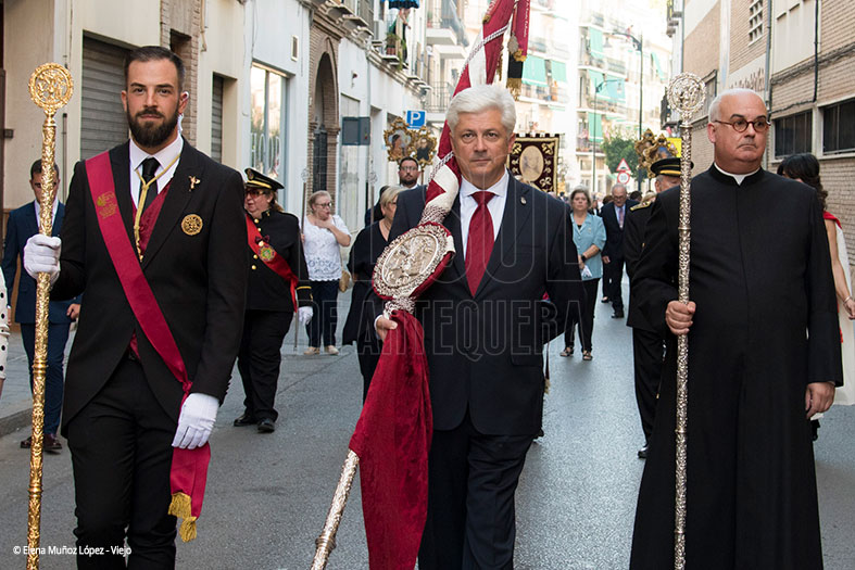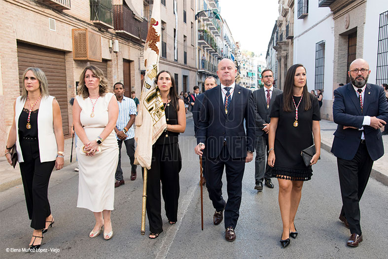 Tras Ella, devotos y el Ayuntamiento, con el Alcalde al frente y la concejal más joven, María Sierras, llevando el Pendón de la Ciudad. Concluía la banda de Jaén.