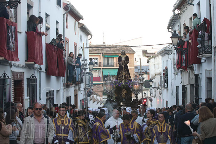 El cortejo lo abría la Virgen de la Piedad que vio cómo le recibía su barrio. En Porterías: ¡todos los balcones con gente y adornados! Silencio en la calle, admiración a la Virgen y al Señor y algún chiquillo que vitorea a los titulares. Entrada con giro milimétrico en Vega donde unos balcones adornados que no parecen de Antequera, con aires de capital hispalense. Petaladas, una niña de un mes que se acerca a ver al Señor y doble curva para entrar en Porterías.