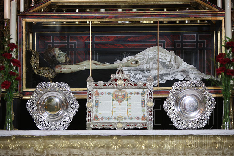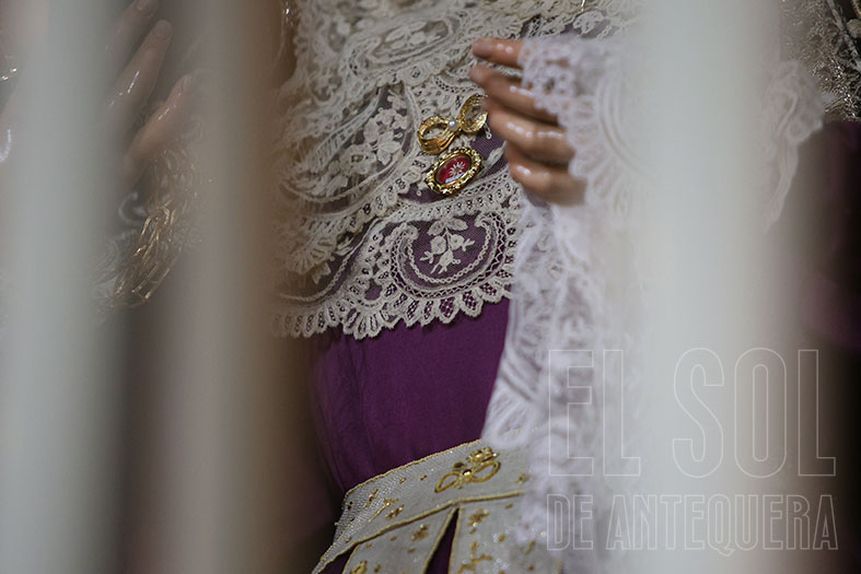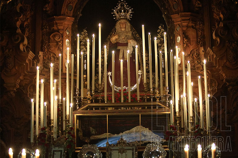 La Soledad, otra cofradía referente en el montaje de cultos, aprovechando el altar mayor y vaya altar mayor que conservan en la parroquia antequerana. Por cierto, que la Virgen de la Soledad luce en su pecho la Reliquia de la Beata Madre Carmen.