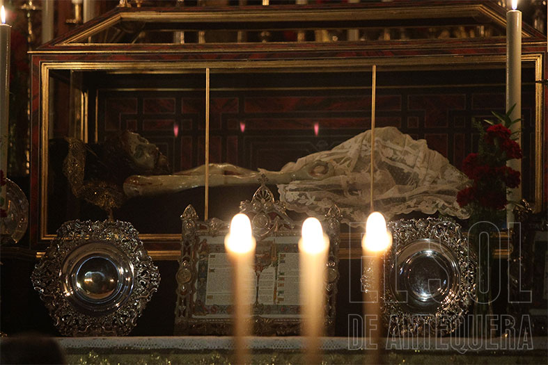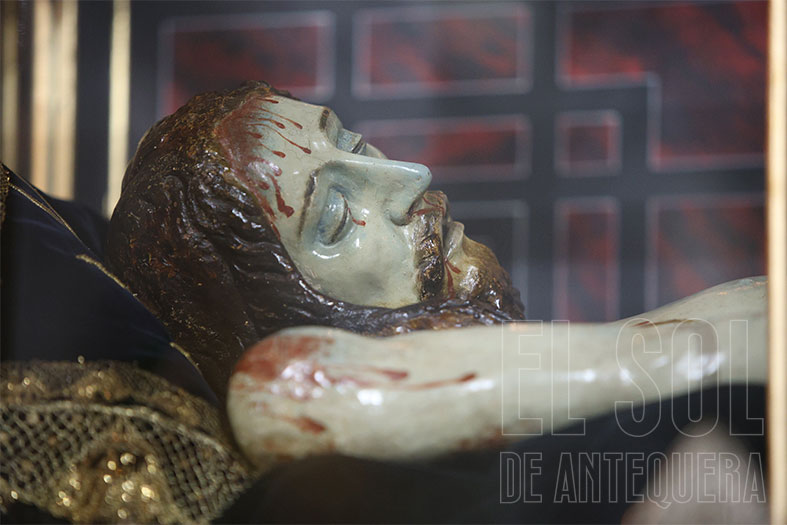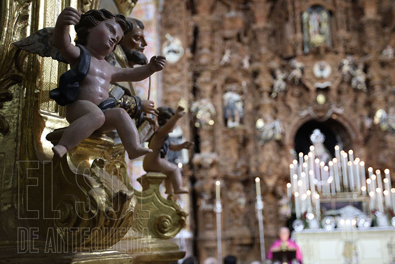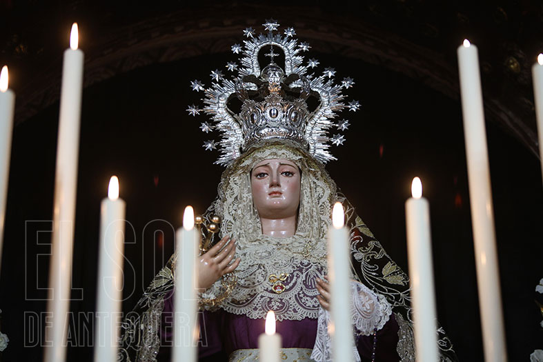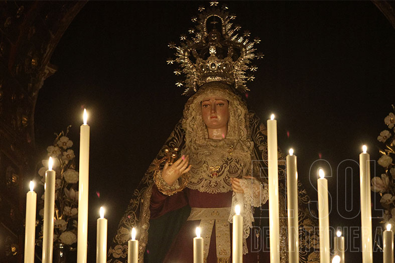 La Soledad, otra cofradía referente en el montaje de cultos, aprovechando el altar mayor y vaya altar mayor que conservan en la parroquia antequerana. Por cierto, que la Virgen de la Soledad luce en su pecho la Reliquia de la Beata Madre Carmen.