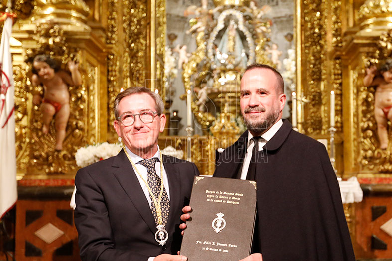 Y empezó la presentación, con la luz creando un triángulo en el presbiterio: la Virgen de los Remedios, el atril y el Cartel aún resguardado. “La Pasión de Cristo es el culmen del amor de Dios y la fuente de nuestra esperanza y sentido, transformando la cruz de signo de maldición a bendición, enfatizando el papel crucial de la Virgen María como modelo de fe y amor, quien acompañó a Jesús hasta la cruz y nos enseña a decir “sí” a la voluntad de Dios, un “sí” que se vive en el servicio diario y en la caridad”.