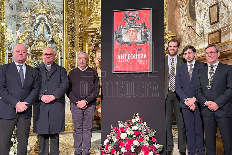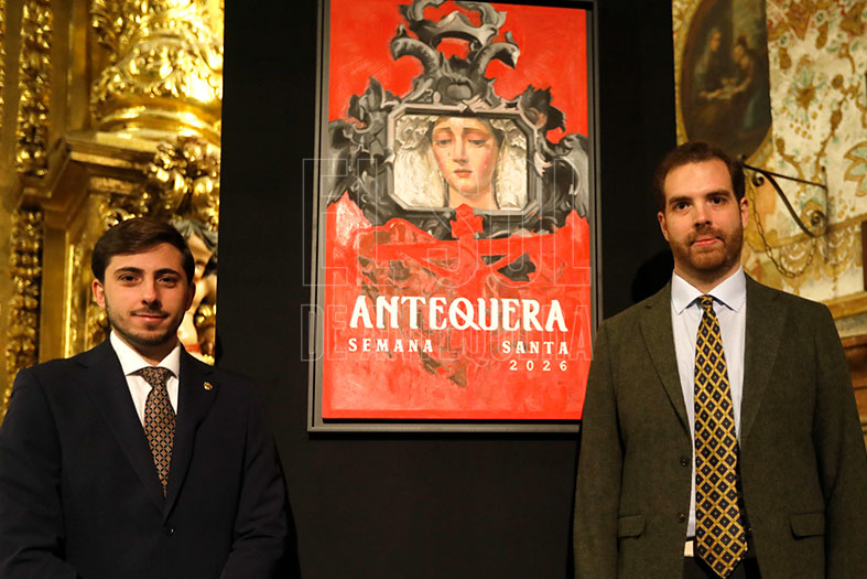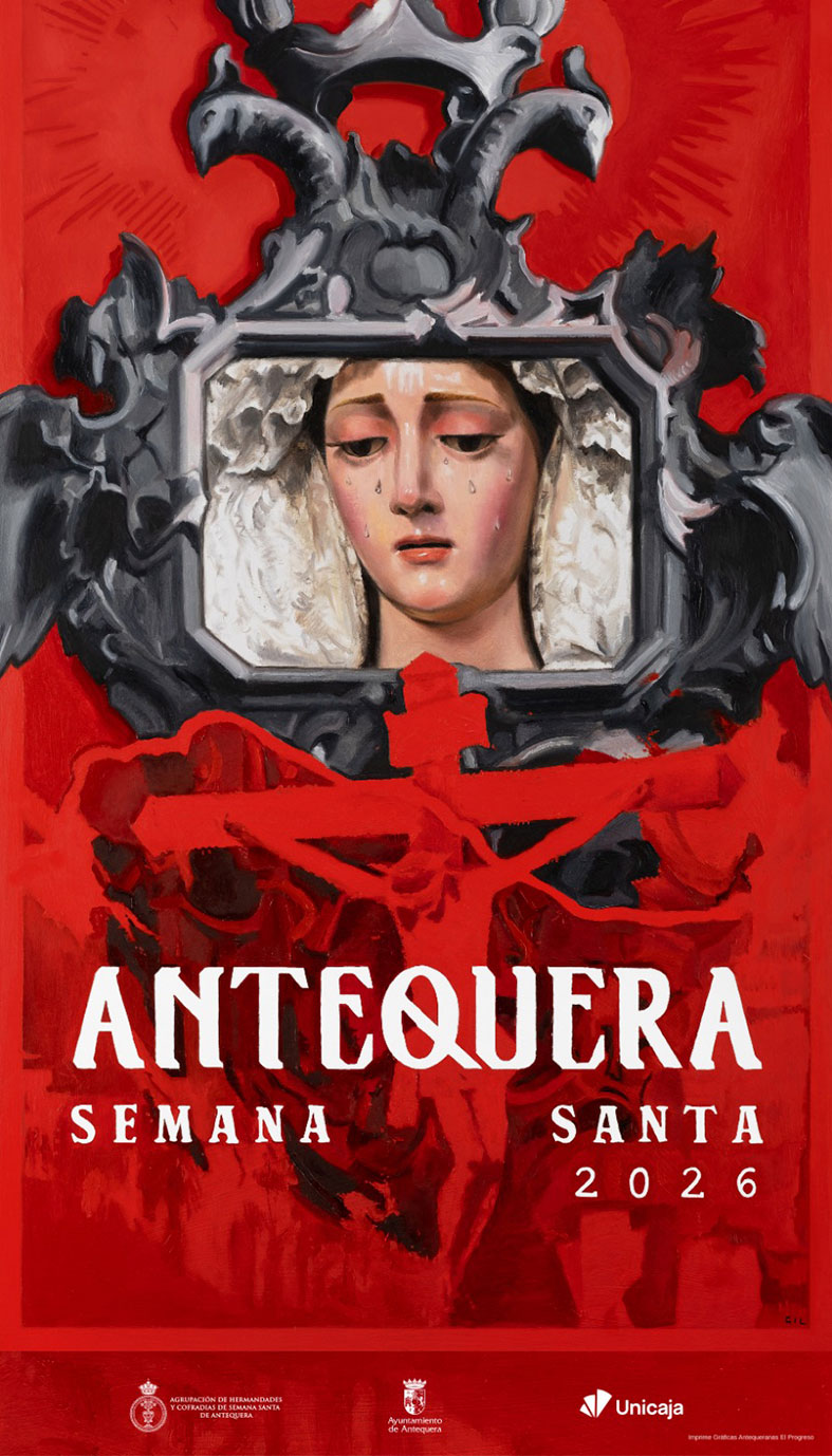 El Cartel de la Semana Santa de Antequera de 2026 plasma a la Virgen del Consuelo reflejada en una cornucopia, en cuya base fusiona al Cristo de la Misericordia con la Peña de los Enamorados, todo ello pintado por el artista sevillano Ricardo Gil, que fue desvelado en una presentación pura y dura del joven cofrade Carlos Montes Corredera en la noche del viernes 23 de enero en la iglesia de los Remedios.