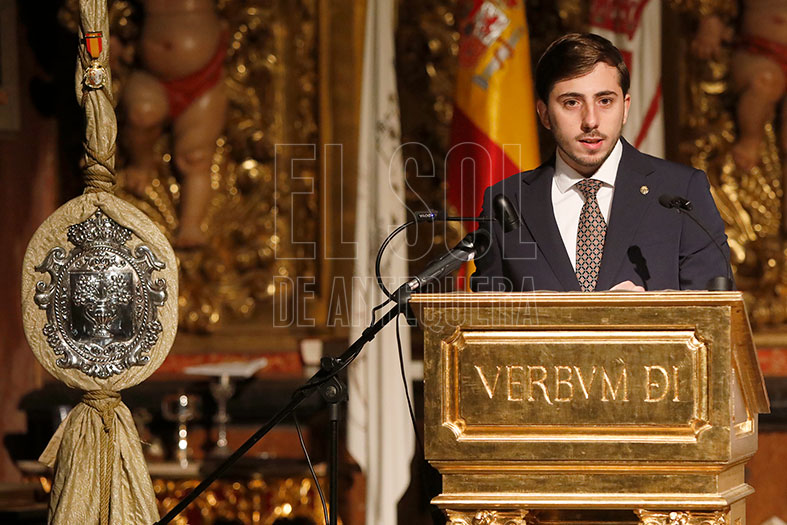 Tras el saludo, quiso dedicar su presentación “a mis abuelos María del Mar y Pepe, a mis padres y familia”, “a mi amigo y hermano de corazón Miguel Ángel” y a “Visi Bracho, que es ejemplo de trabajo, constancia y dedicación hacia su cofradía del Consuelo”.