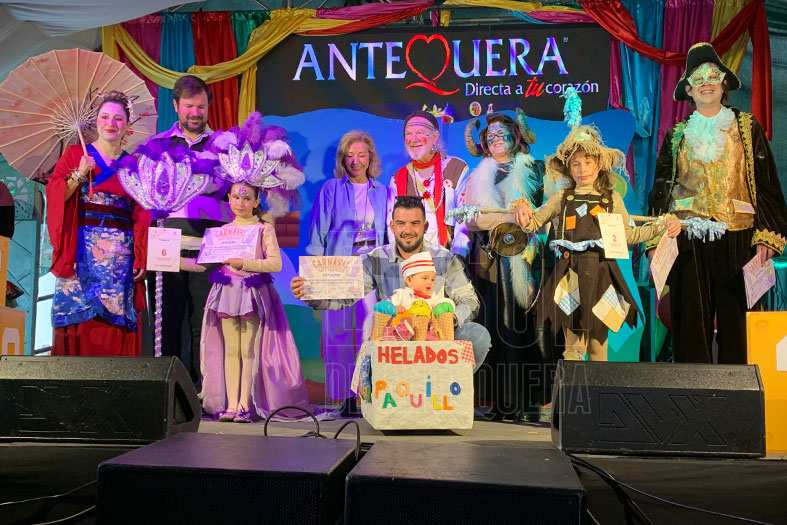 En la modalidad individual se llevó el primer premio el simpático “Helados Paquillo”, el segundo fue para “El huerto de Adriana” y el tercero para “Ninfa de Carnaval”; participaron 9 concursantes en esta categoría. En parejas, con sólo 3 participantes, ganaron “Pretty woman”, el segundo premio fue para “Dos policías muy chungos” y el tercero para “Historia de terror”. Con la modalidad de grupos, con 8 inscritos, la diversión y originalidad estuvieron muy presentes. El primer premio fue para “Abejitas chiquititas”, el segundo se lo llevaron “El tardeo antequerano” y el tercero para “Chiquifaraones”.