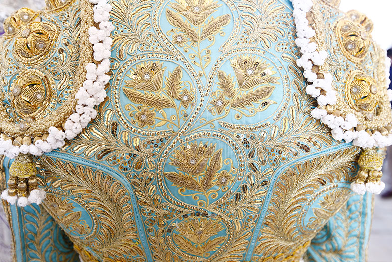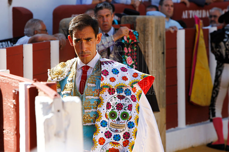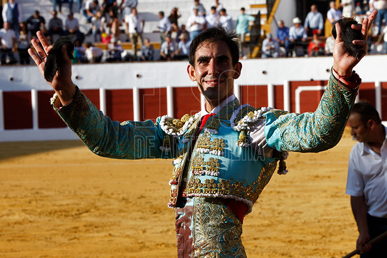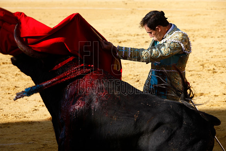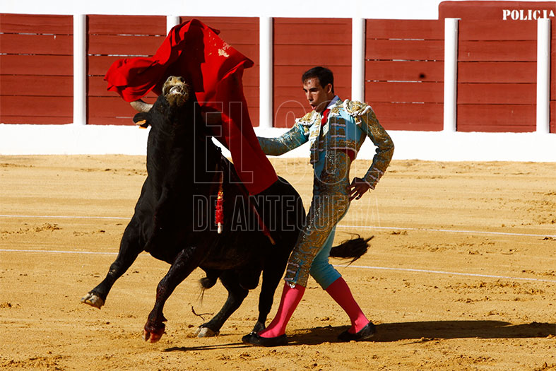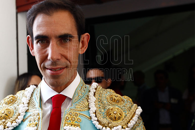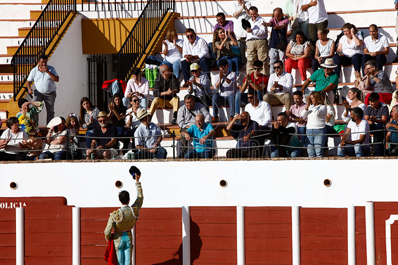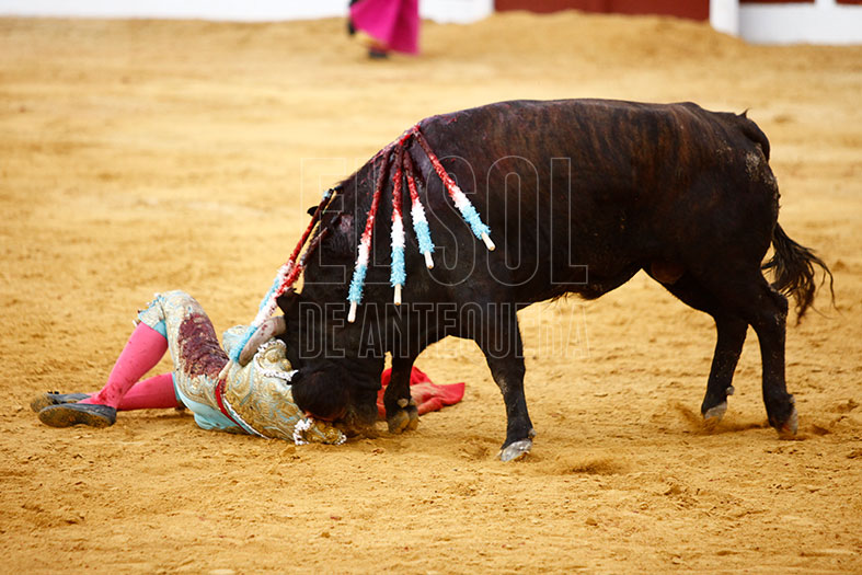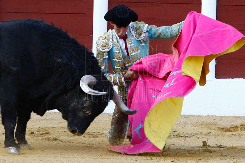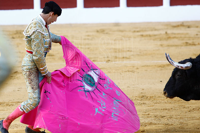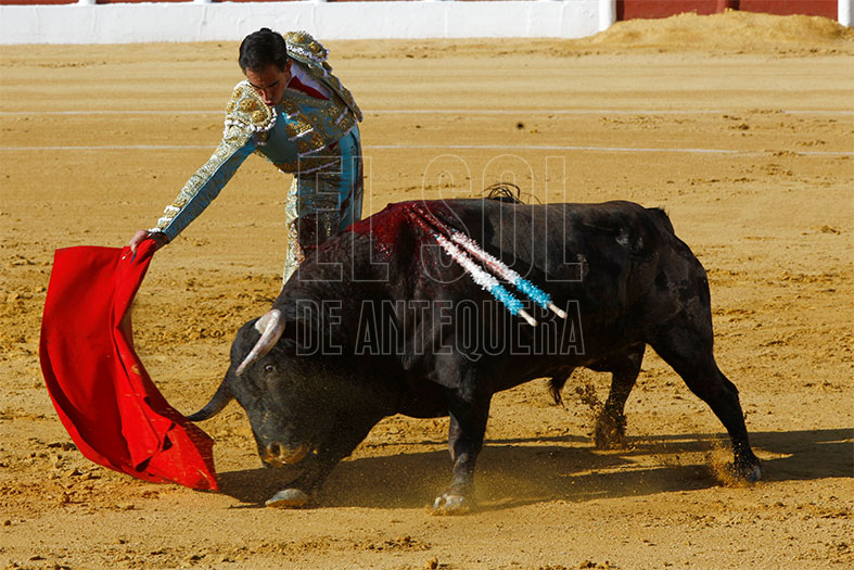 Vestido de agua marina y oro, estaba preparado para los seis de la tarde. En el tendido alto, la Banda de Música Vera Cruz de Almogía que amenizó las faenas. Para empezar, «Tuercepiés» de Manuel Blázquez, levantando los primeros olés con verónicas. Y tras brindar el toro a los tendidos y varias tandas, mató a la primera y cortó la primera oreja de la tarde. El segundo, «Portilloso» de El Pilar, al que menos le pudo sacar, la entrada a matar le costó irse de trofeos libre.