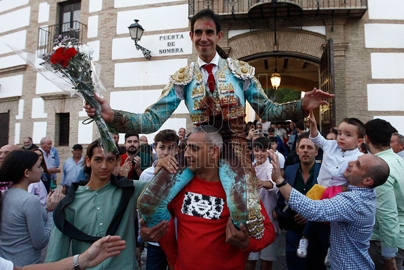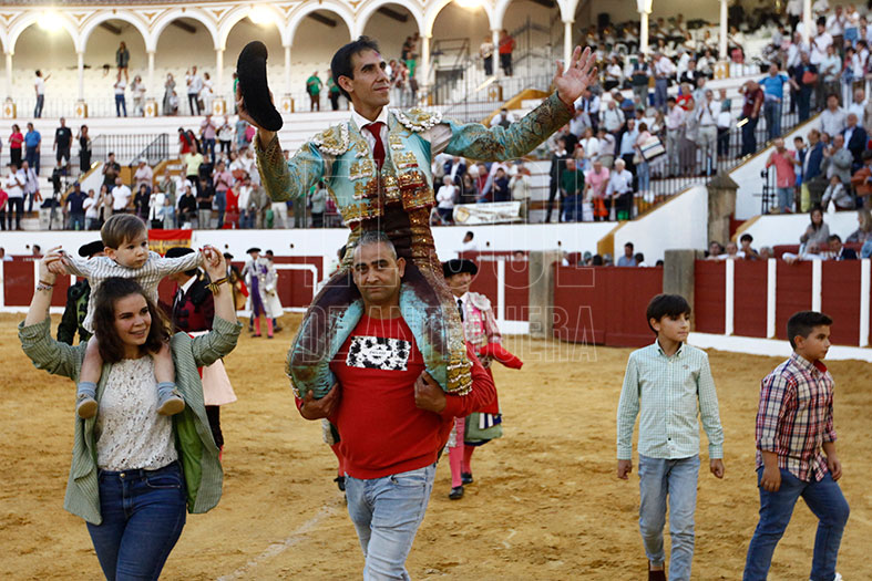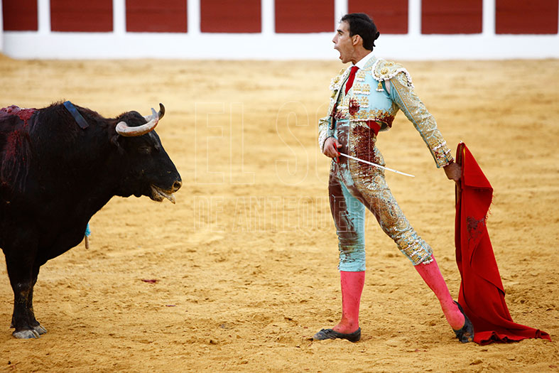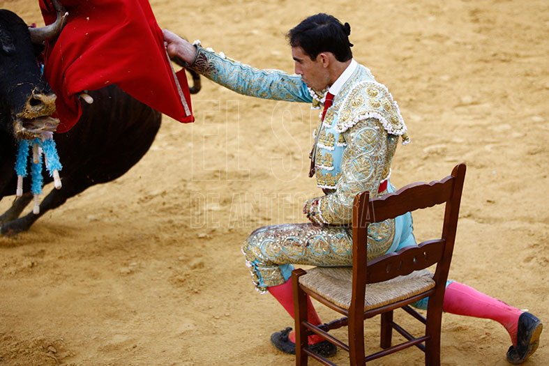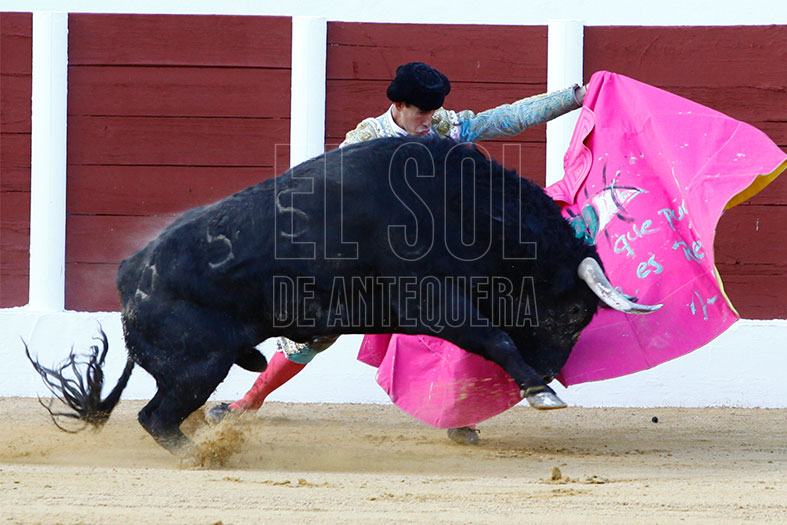 El tercero, de lo mejor que se vio en la corrida, «Petroneo» de Julio de la Puerta. Lo recibió de rodillas, avisó que venía una gran faena. Tropezó y dio el primer revolcón de la tarde. Y puso al público en pie al dedicar la faena a los miembros de ADIPA (Asociación de Discapacitados Psíquicos de Antequera), con quienes compartió una clase días previos. Se gustó por naturales y conseguía dos orejas y vuelta al ruedo al toro.