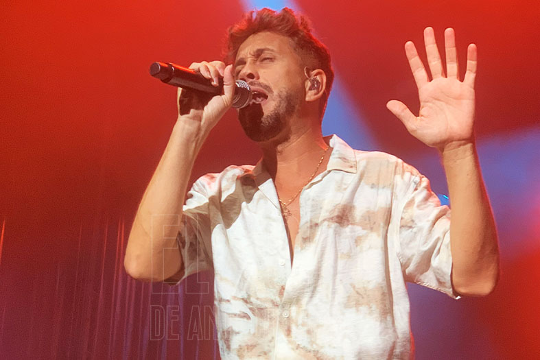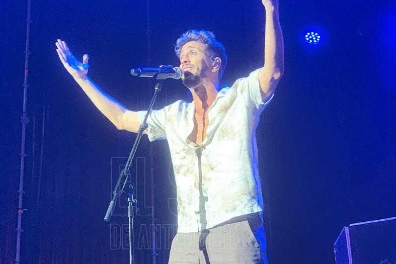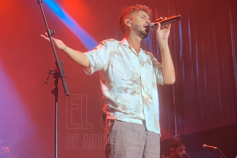 Pasadas las 12 de la medianoche, el sevillano apareció en escena para interpretar los temas de sus distintos discos, acompañado a coro, por sus seguidores que en primera fila no quisieron perderse la vuelta a Antequera de este artista.