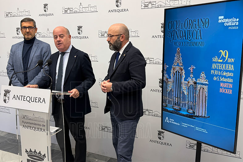 El alcalde, Manolo Barón, junto al delegado territorial de Cultura de la Junta de Andalucía, Carlos García, y el concejal de Cultura, José Medina Galeote, presentaron el viernes 21 este ciclo que está recorriendo desde noviembre y en diciembre distintos puntos de la geografía andaluza con conciertos de órganos históricos.