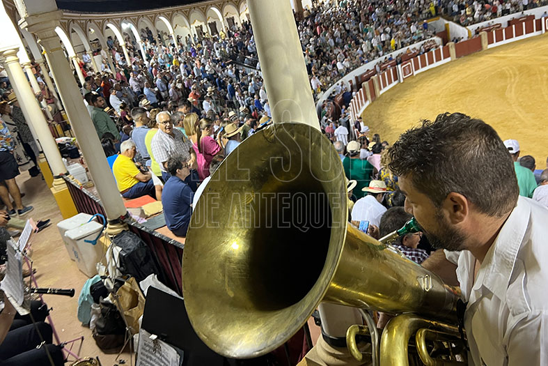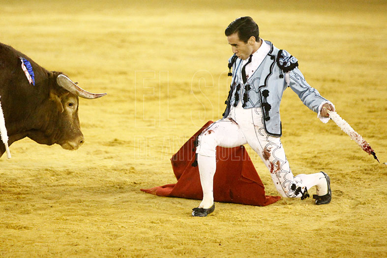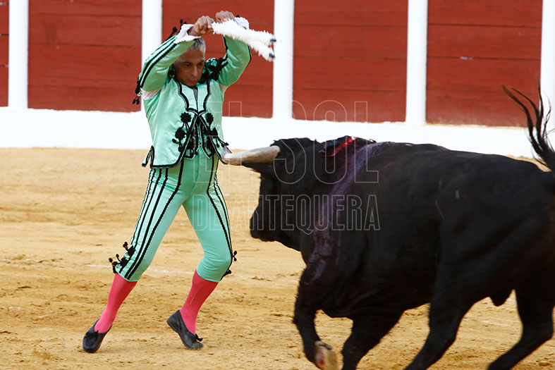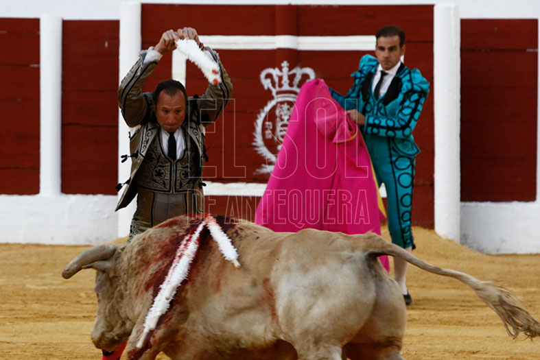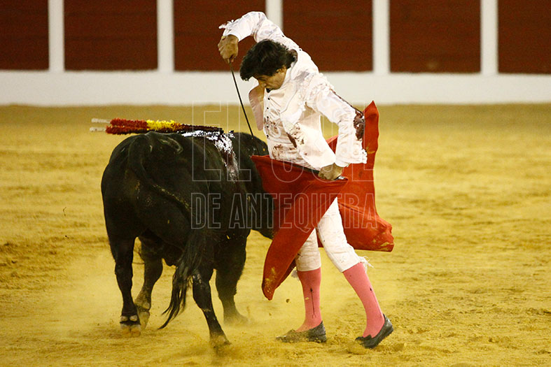 Lo tenía que dar todo y así lo hizo en el segundo. Necesitado de trofeos para acompañar a sus compañeros de cartel, tiró de un buen recibimiento por verónicas, a las que siguió un buen quite. Tras brindar el toro al empresario de Narbona Solís, fue tirando de la embestida del toro, que si bien no acompañó por uno de los pitones, por el derecho le permitió ligar buenos muletazos y así tener una buena faena acompañada por los sones de la Banda de Música de Almogía que fue aplaudida por el solo ofrecido por el solista Miguel Muñoz Béjar con el pasodoble «La Concha Flamenca» de Perfecto Artola Prats. Remató con una gran estocada, y así logrando dos apéndices.