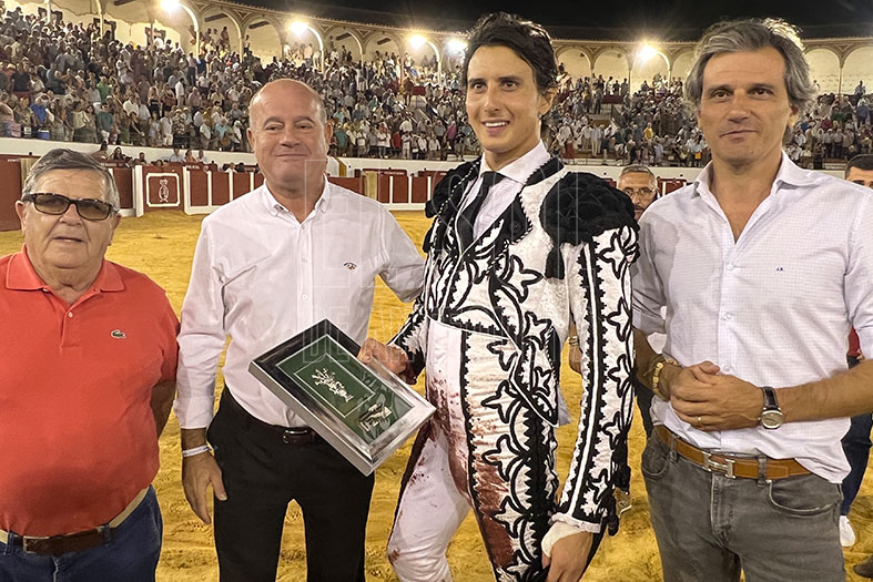 Antes de marchar por la puerta grande con sus compañeros, el alcalde Manuel Barón, el presidente de la Peña Taurina Los Cabales Juan Herrera y el empresario Jorge Buendía, le entregaron el trofeo como Triunfador de la Goyesca de 2023 a Roca Rey.