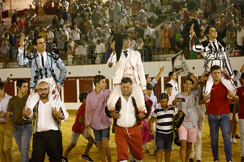 Toreros: Curro Díaz, de rosa palo y ribetes blancos: una oreja y una oreja; Juan Ortega, de purísima y azabache: aplausos y dos orejas; Roca Rey, de blanco y azabache: indulto, dos orejas y rabo y una oreja.