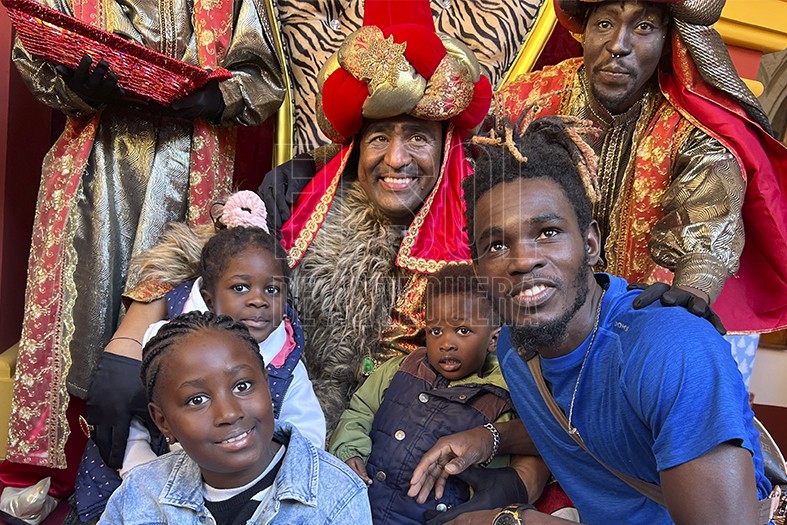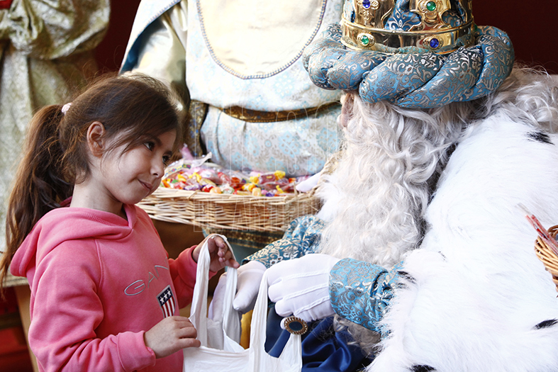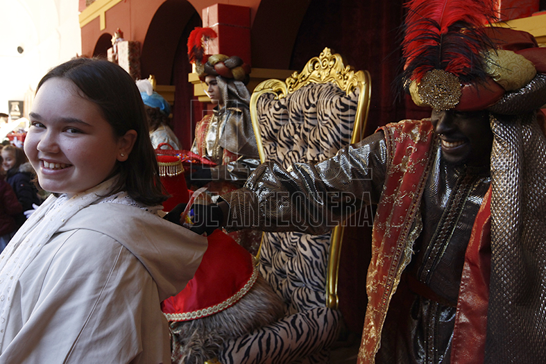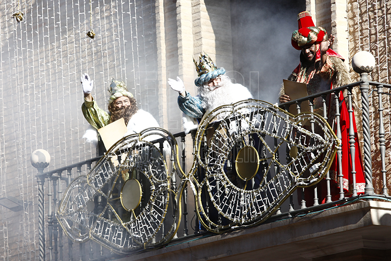 Entraron por la puerta principal, con villancicos de fondo y recibieron un recuerdo por parte del consistorio. De allí saludaron desde los balcones, primero, y luego lanzaron molletes, mantecados, caramelos y… pelotas de plástico.