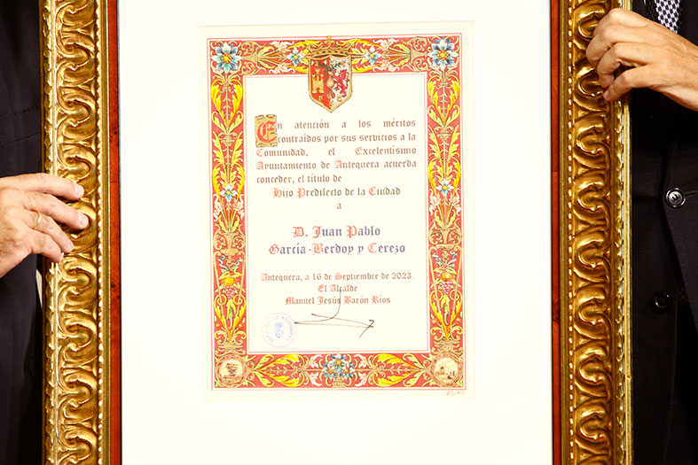 El diplomático Juan Pablo García-Berdoy y Cerezo fue nombrado hijo predilecto. El galardonado recordó a su familia con la historia de la ciudad. Hubo dos nuevos hijos adoptivos: por un lado, Francisco Blázquez García, presidente de la Real Federación Española de Balonmano, quien agradeció este gesto y agradeció la pasión que hay por el balonmano en Antequera; y Maite Palomino Granados, del Grupo IDEC del Puerto Seco. Se lo dedicó a sus padres, quienes tuvieron que emigrar desde Antequera hasta Cataluña donde nació ella y ahora regresa con el gran proyecto logístico.