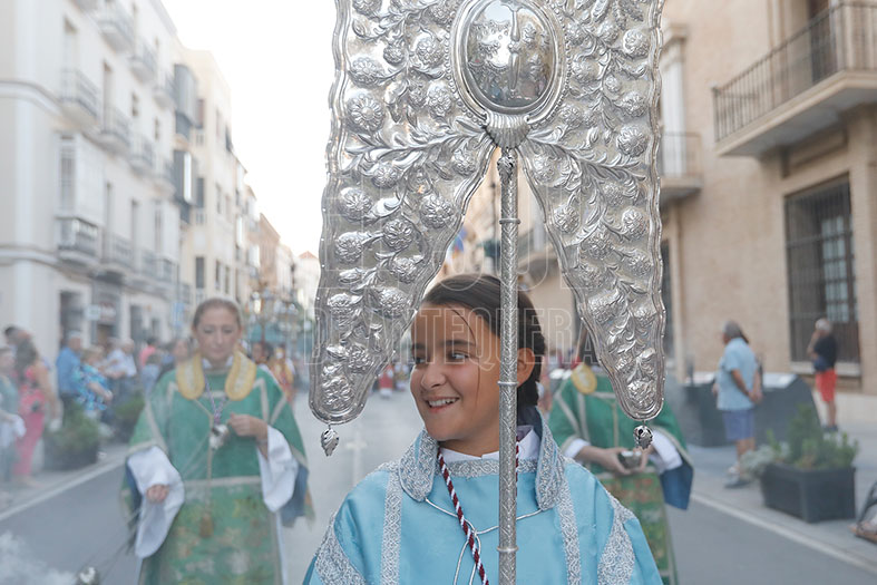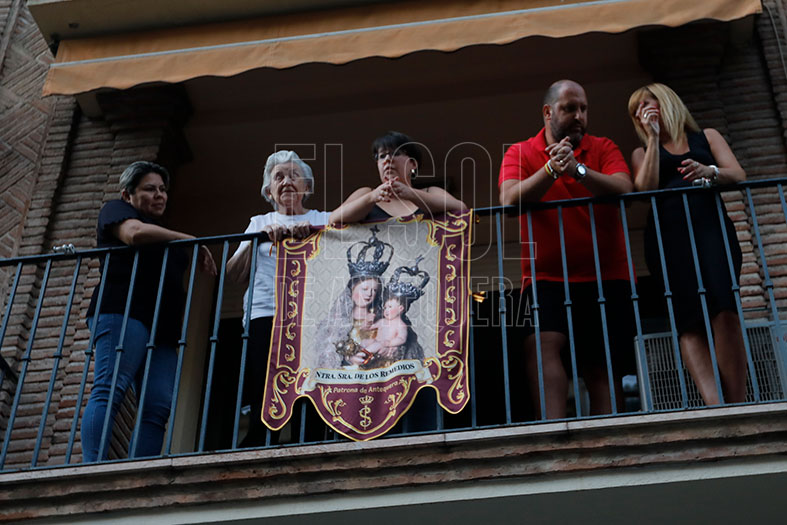 Tras la misa, a las 20,06 horas, el hermano mayor de insignia, Justo Moreno Muñoz, tocaba la campana para avisar a sus hermanacos que iba a empezar la procesión. El cortejo se había formado en la calle Infante don Fernando. Salida estrecha y complicada del templete de plata de la Virgen, primero por la puerta de la iglesia con el atrio y por último de éste con la calle.