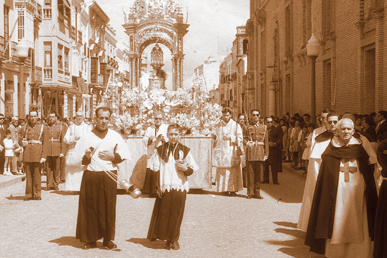 La Custodia era dirigida por el párroco de San Miguel, Antonio Alarcón, acompañado por los presbíteros asistentes: el párroco de San Pedro, Bartolomé Lobo; el capuchino José Luis de Ausejo; el trinitario Gabriel; y el carmelita Anselmo. La Guardia Civil “daba escolta de honor al Santísimo Sacramento, a cuyo paso se arrodillaba la multitud que presenciaba la procesión en todas las calles”.