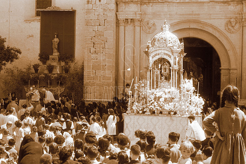 Así “la procesión eucarística, con la acostumbrada solemnidad, salió de la Insigne Iglesia Colegial y Mayor Parroquial de San Sebastián, a las diez, con el siguiente orden: banda de cornetas y tambores del Frente de Juventudes; manga y cruces parroquiales con ciriales; grupos de niños y niñas de primera Comunión”.
