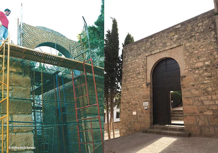 Aunque la Alcazaba contaba, desde el comienzo de los años ochenta del siglo pasado, con un servicio de jardinería propio –hoy inexistente–, lo cierto es que, al ser un espacio completamente abierto por numerosos puntos, eran bastantes los destrozos que se hacían en los jardines, particularmente las noches de los fines de semana. Para la consecución de un recinto de carácter cerrado y, por tanto, controlable en horas intempestivas, nos planteamos a partir de 1999 un plan que implicaba un importante conjunto de obras que tardaría más de una década en concluirse. Ello suponía la excavación y reconstrucción de las murallas que desde la torre Blanca bajaban hasta el llamado camino de “los pinos del Reloj”, que parte del Portichuelo. También la construcción de un fuerte muro de ladrillo que arrancando de las traseras de las casas del callejón de la calle de San Salvador terminase en la nueva puerta de acceso posterior al Recinto Monumental, en un punto inmediato a la muralla reconstruida. La otra obra necesaria era configurar un acceso de cierta monumentalidad, en un punto cercano al Arco de los Gigantes. Esta nueva puerta se planteó a la vuelta del murete construido en los años setenta del siglo pasado, en evitación de quitarle protagonismo al referido Arco. Para que todo ello cumpliera la función buscada se hacía necesario también un proyecto de restauración-reconstrucción de las antiguas barbacanas, ya que algunos lienzos de muralla, particularmente de los que dan cara a la plaza de San Sebastián, carecían de altura “defensiva” original, en gran parte por antiguas acumulaciones de escombros domésticos. Todo este programa de obras, de enorme complejidad técnica y arqueológica, se llevó a cabo entre los años 1996 y 2010. Pero vayamos por partes.