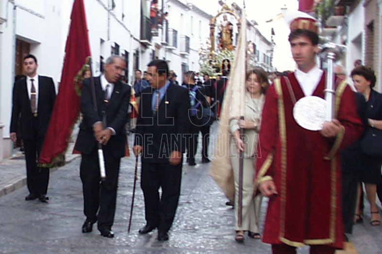 La camarera María Teresa Clavijo Pinto recuperó para la ocasión, la figura de los maceros que abrieron paso a la representación municipal, elaborando las ropas en las antiguas que se tenían. Los pendones de Antequera y Sevilla fueron portados por los concejales Carmen Rosa Torres y José Antonio García, acompañados de los tenientes de alcalde Ricardo Millán y José Cobos, que se turnaron en la representación del alcalde, y del hermano mayor de la Hermandad, Ángel Guerrero.