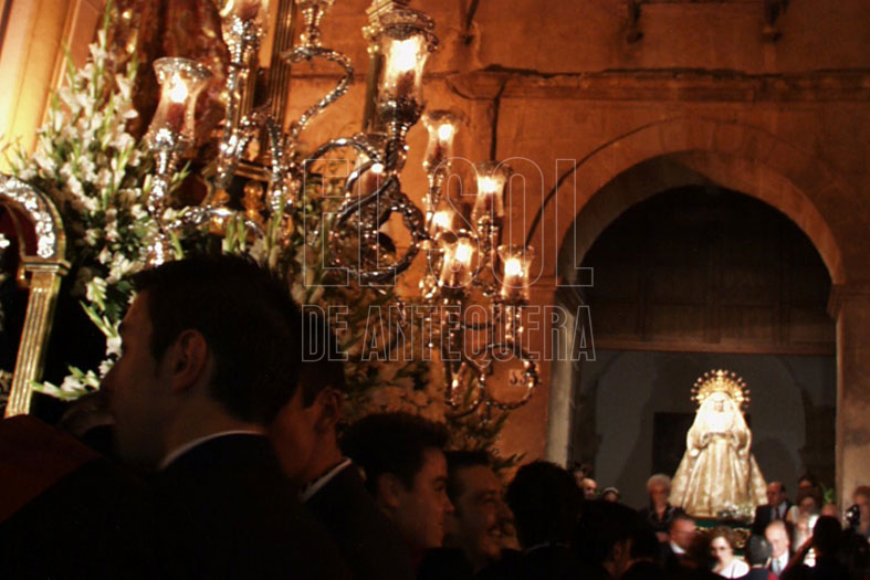 La directiva de San Pedro, como antes lo había hecho la de La Pollinica, sorprendió a los cofrades de Santa Eufemia, al sacar la imagen bellísima del Consuelo a la puerta del templo.