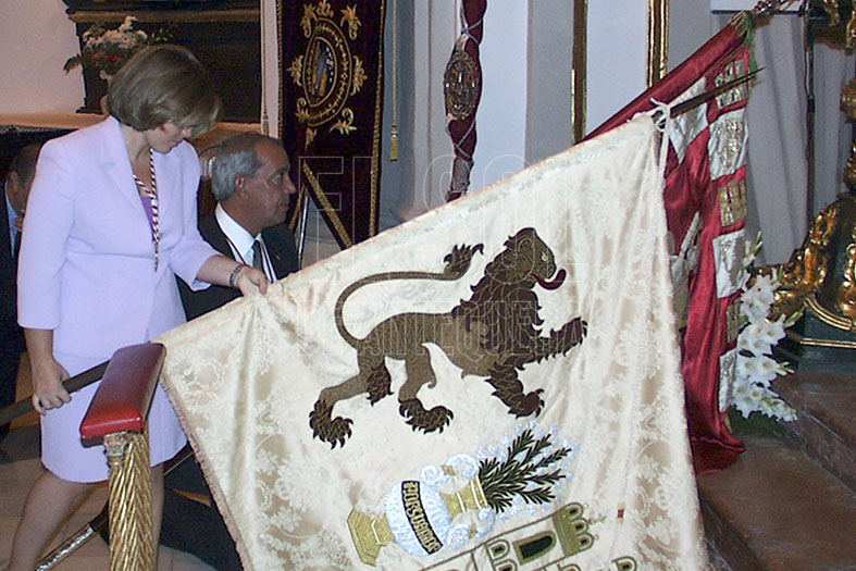 Pendones en la consagración, así como los hermanos mayores de La Pollinica, Consuelo y María Auxiliadora Manuel Sotomayor, Francisco Sillero y Carmen Carrasco, junto a Federico Esteban y señora, hermanos mayores honorarios de La Pollinica, Julio Matas, hermano mayor del Rescate, y representaciones de las Cofradías del Socorro, La Paz, y Señor de la Salud y de las Aguas.